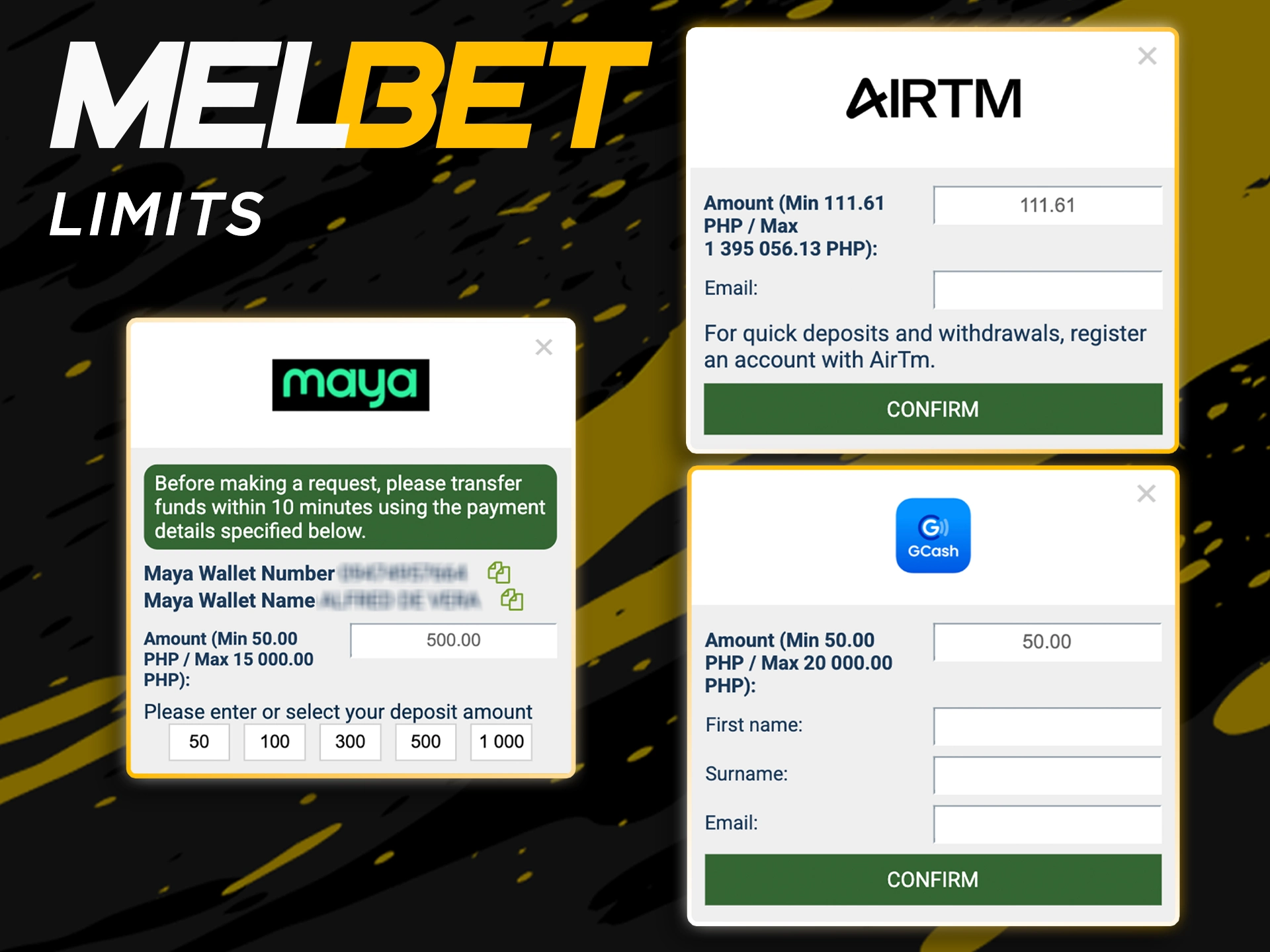 MelBet has minimum and maximum limits for deposits and withdrawals, and it depends on the methods used. The minimum deposit amount is PHP 25 (for GCash) and the maximum amount may vary depending on the method selected. For withdrawals, the minimum amount is PHP 50 (for GCash Direct) and the maximum amount depends on the terms and conditions of the payment system. Please note that if cryptocurrency is used, the limits may be lower.